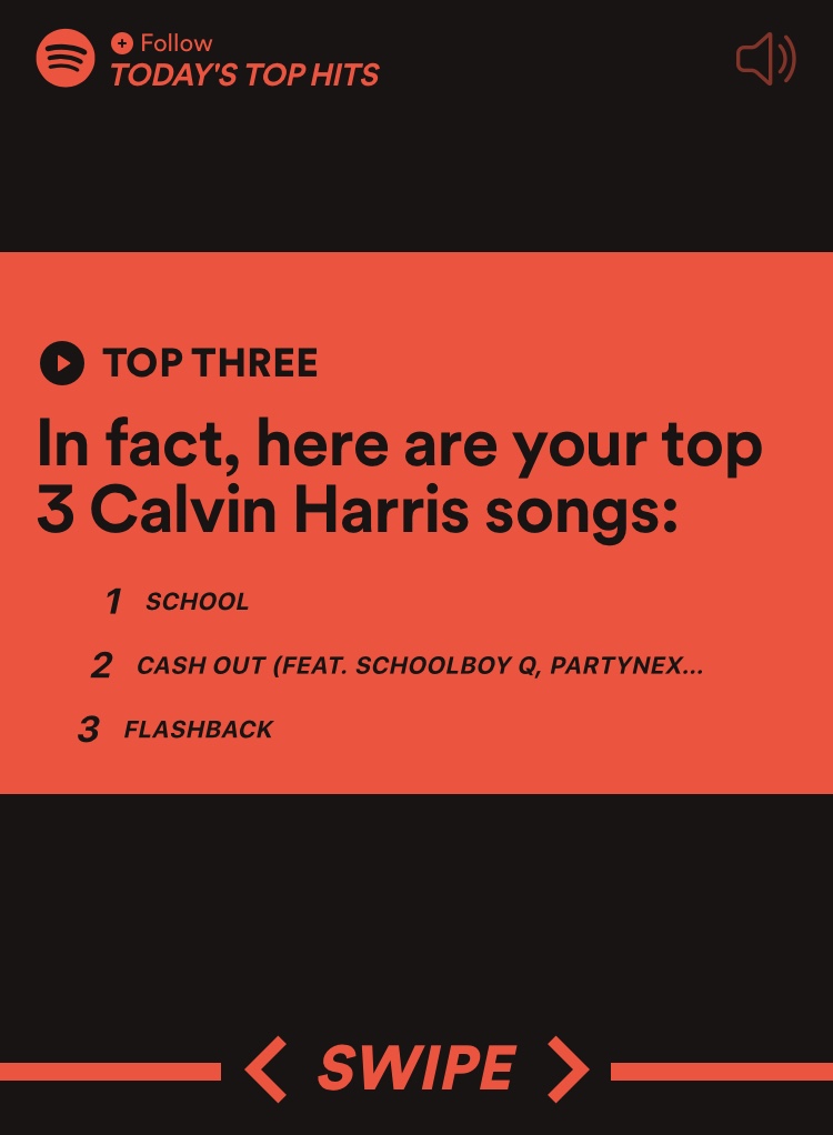 While Calvin Harris’ “School” may be one of the greatest songs ever created under 2 minutes in length, he’s definitely not who I expected to see. Especially not that number. Top 9%? And that doesn’t even take into account the amount of times I’ve listened to him via CD in my car.